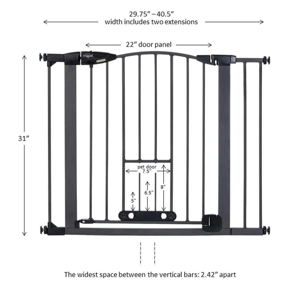 The patented EasyPass pet door makes this gate truly unique. The small door retracts up into the gate tubing at three height intervals (5”, 6.5” & 8”) so it can be left open at the desired height, depending on your pet’s size. This pet door allows smaller dogs and cats the freedom to come and go while larger pets stay contained. When it’s time to close the pet door, simply use the designated slots found on the door and squeeze to gently bring the door down – no annoying dog door that’s been left open to trip over! This dog gate has an extra wide 22” door for the entire family to walk through with ease. To control the direction that the gate swings, a swing control lever allows you to decide – swing in one direction or allow the gate to swing in both directions. There’s also a glow-in-the-dark feature on this gate which illuminates the large easy-grip handle, making it easy for you to see and open the gate at night. The beautiful graphite grey finish and graceful arch on this sturdy steel construction gate will complement your home decor. This gate fits openings from 29.75 – 40.5 inches wide and comes with two extensions. Quickly and easily install this pressure-mounted gate with the twist of the tension mounts. Safety and containment all wrapped up in one gate – how simple. Please note: When you unpack this gate you will notice that it is not square. This is normal and the gate is not damaged. It is manufactured at a pre-set angle so when it is installed properly in the opening, it will maintain the correct amount of tension and prevent it from being pushed out of the opening under normal use. Please read and follow the instruction manual carefully.