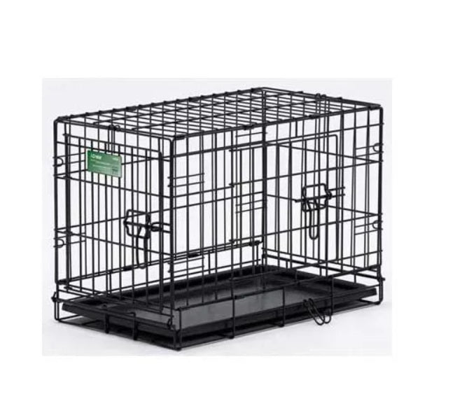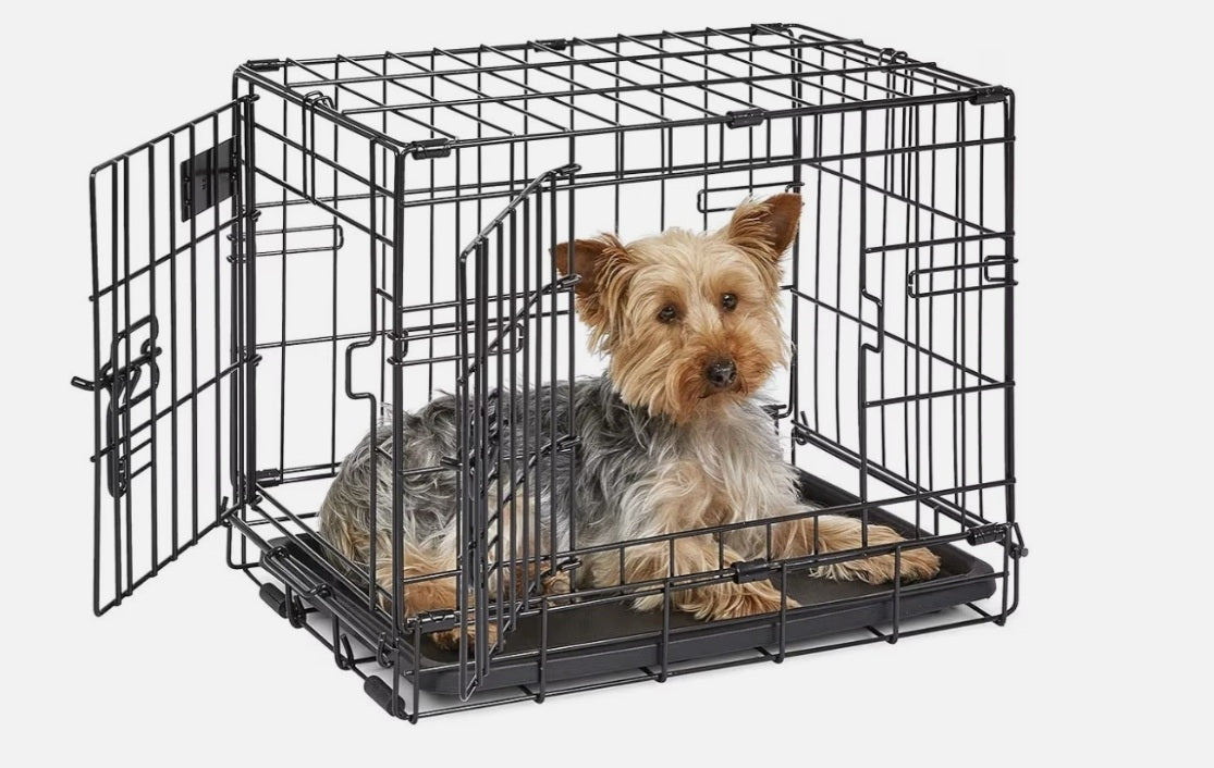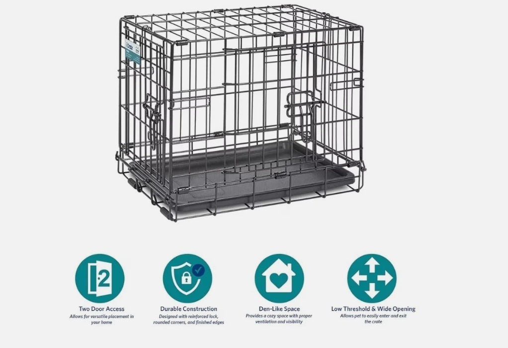 Two doors for easy access to your pet inside either thru the traditional front door or from the side with the second door. The dog crate comes to you equipped with every feature you can think of: a composite plastic pan for easy cleanup in the event of an accident; plastic carrying handle to move the dog crate from one location to another comfortably; safe and secure slide bolt latches for the safety and security of the pet inside and the furniture on the outside; and most importantly a FREE divider panel for use while your puppy is still growing up.
