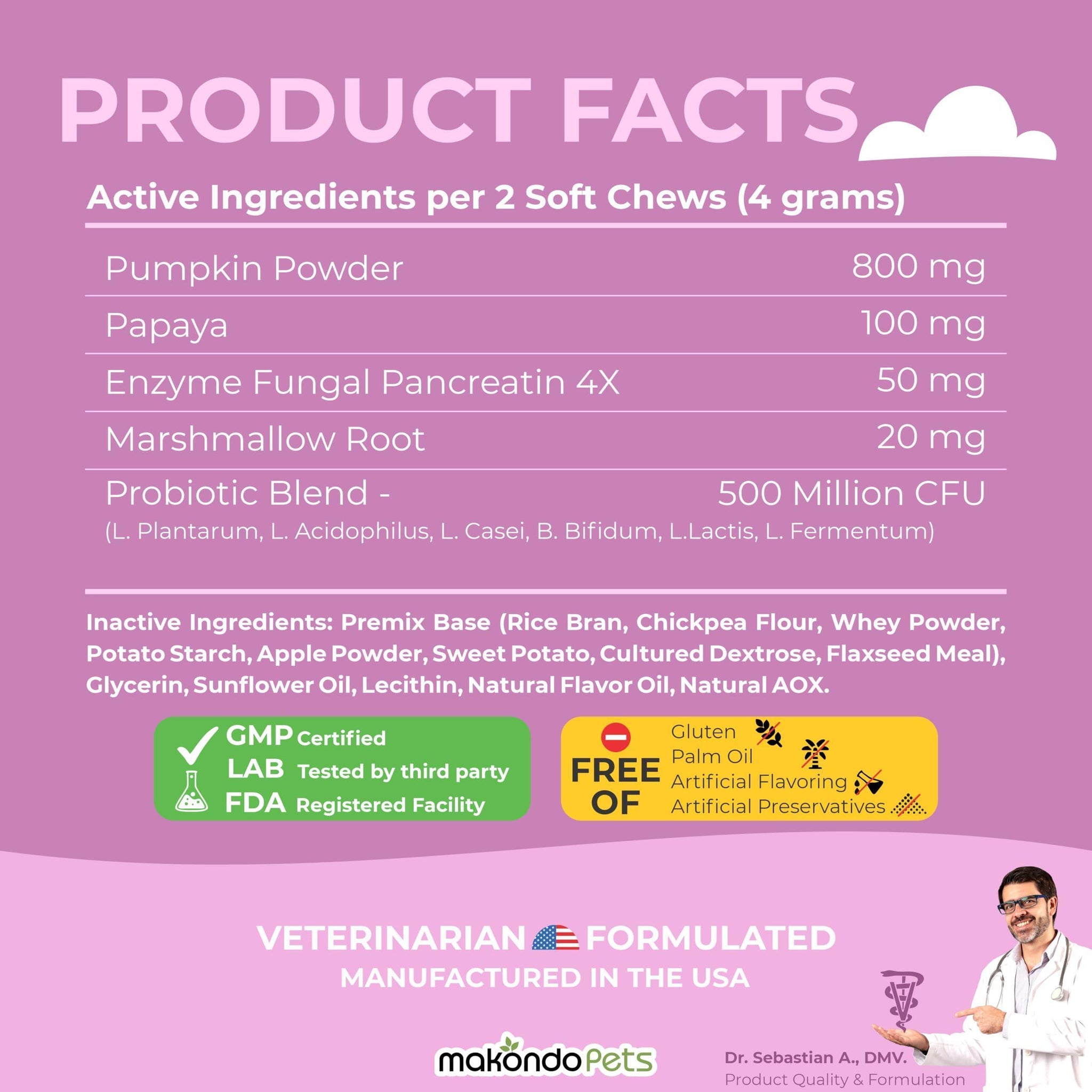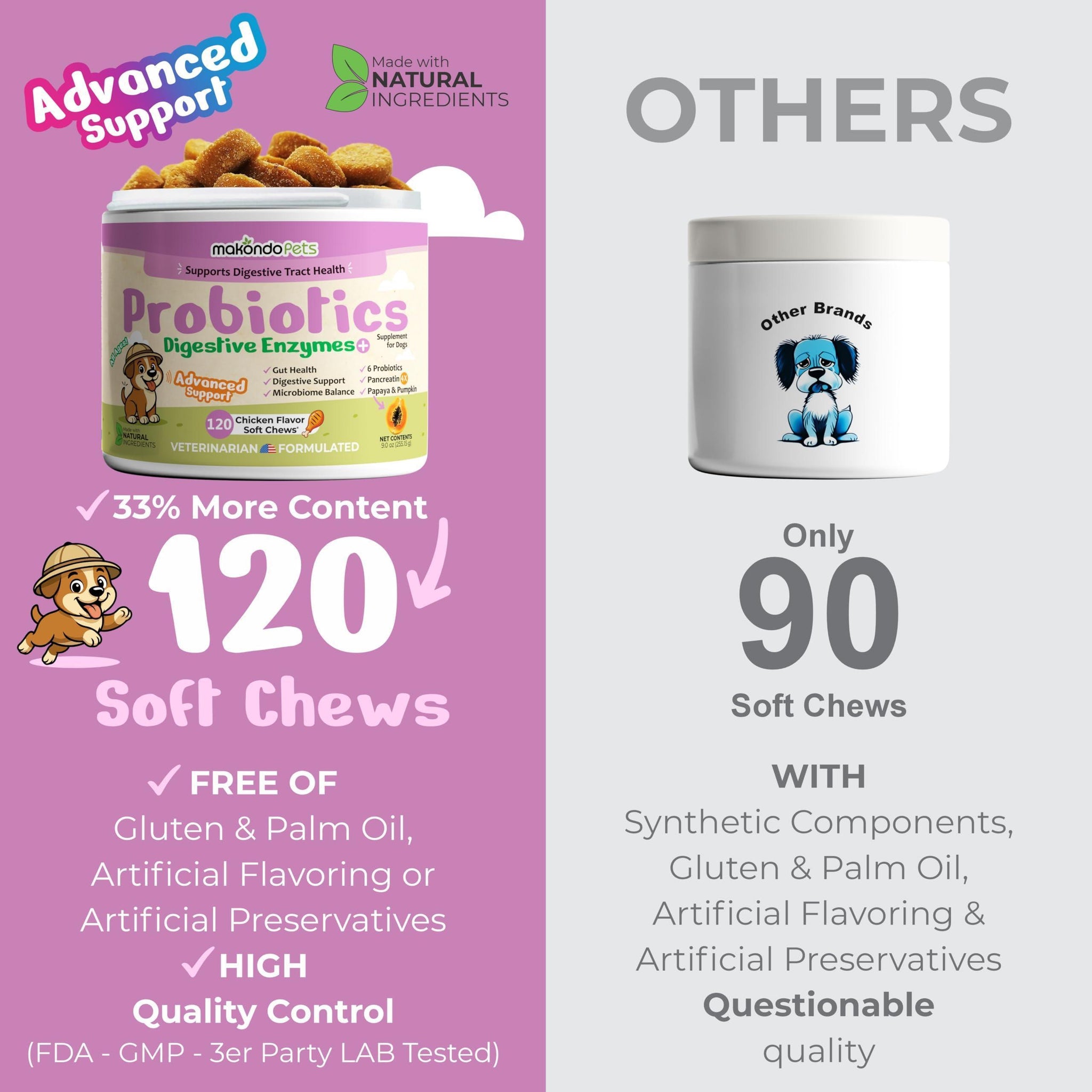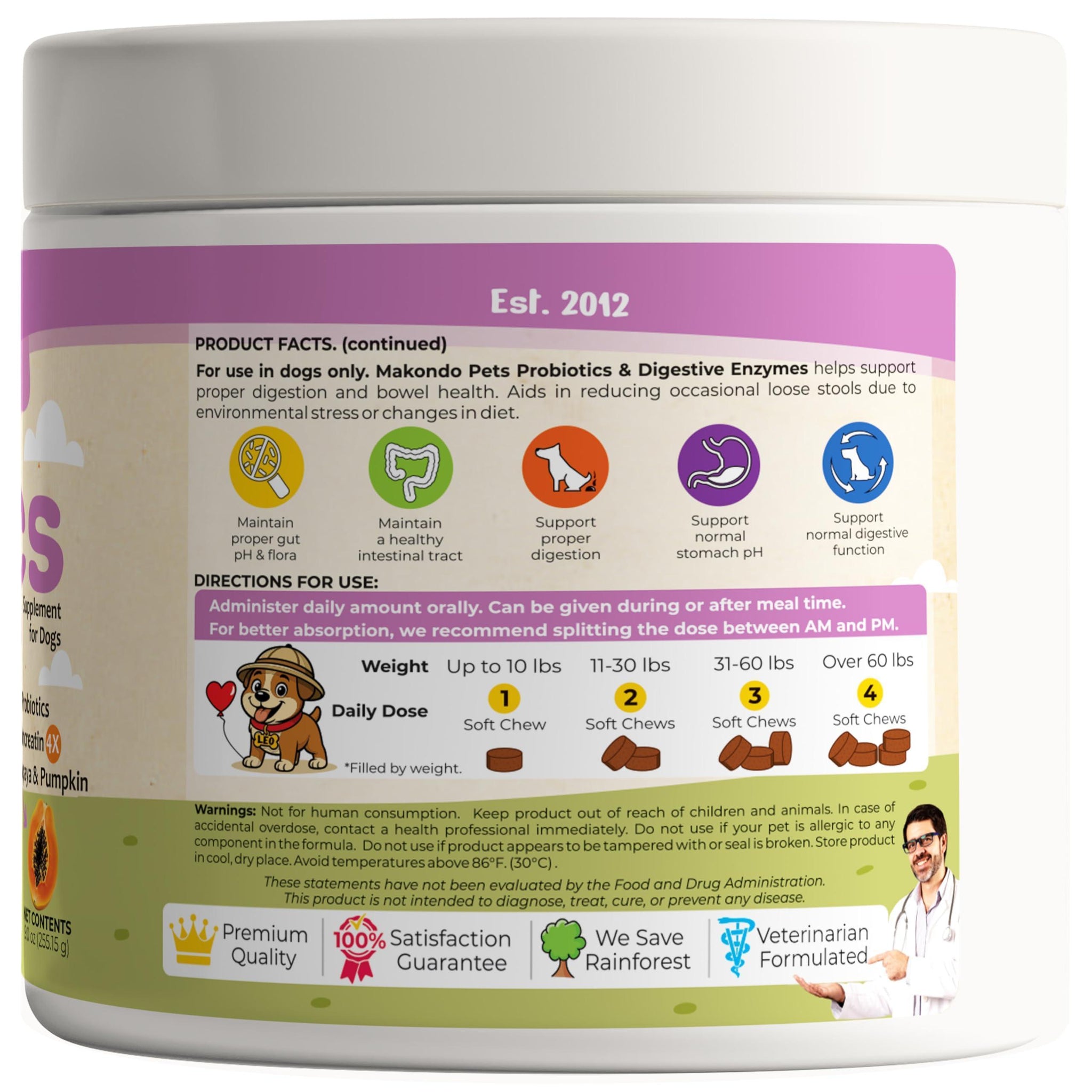 Makondo Pets Digestive Enzymes Probiotics Advanced Supplement Support for Gut Health, Gas, Diarrhea & Constipation Relief  120 Chews. Chicken Flavor