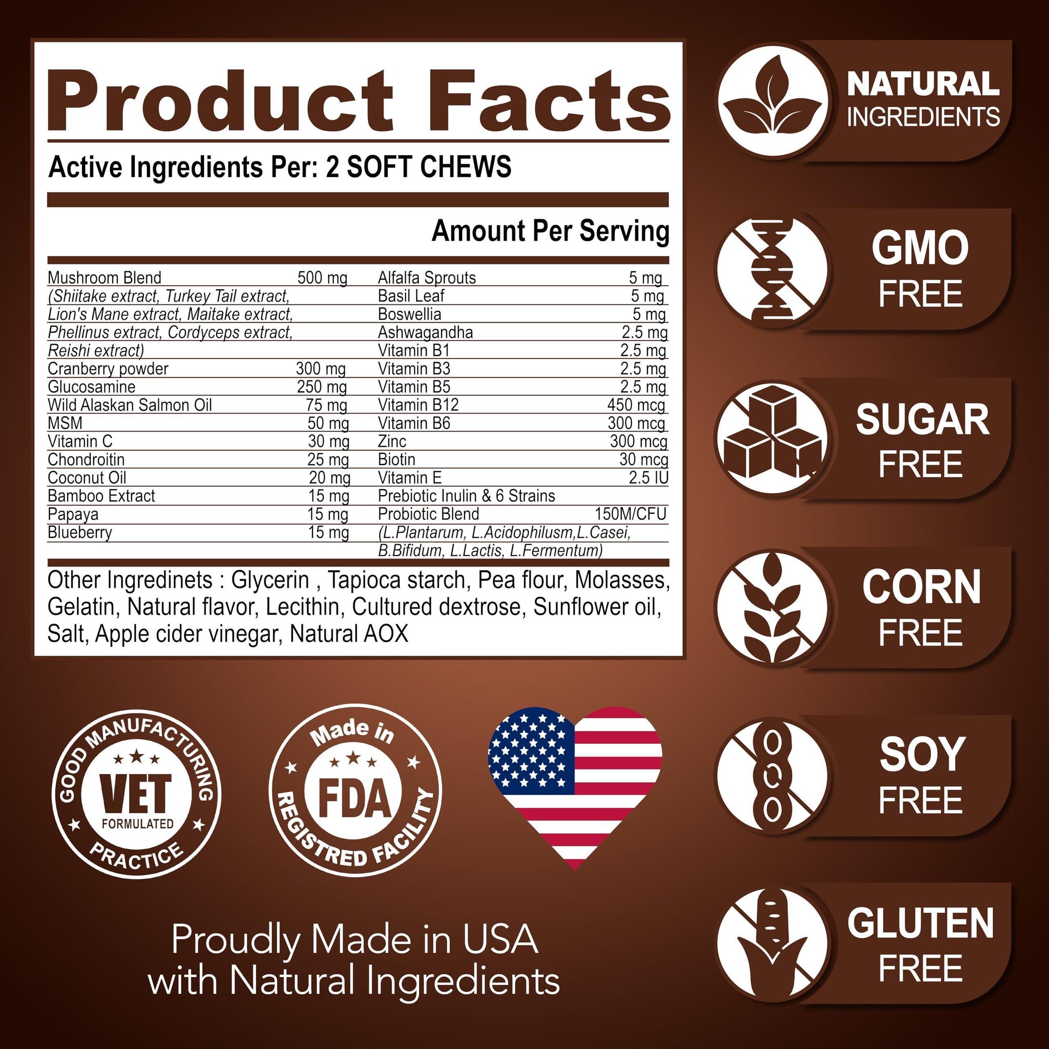 30-in-1 Dog Mushroom Multivitamin Chews: Offers a unique and effective blend of 7 mushrooms, including 6 probiotics, Omega-3 rich salmon oil, glucosamine, promoting your pet's overall wellbeing.