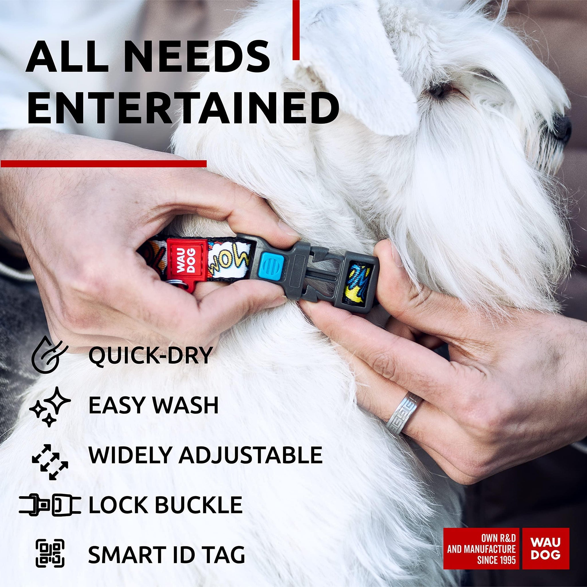 WAUDOG Adjustable Nylon Dog Collar with Durable Plastic Buckle and QR Dog Tag. LARGE (WOW! Print)