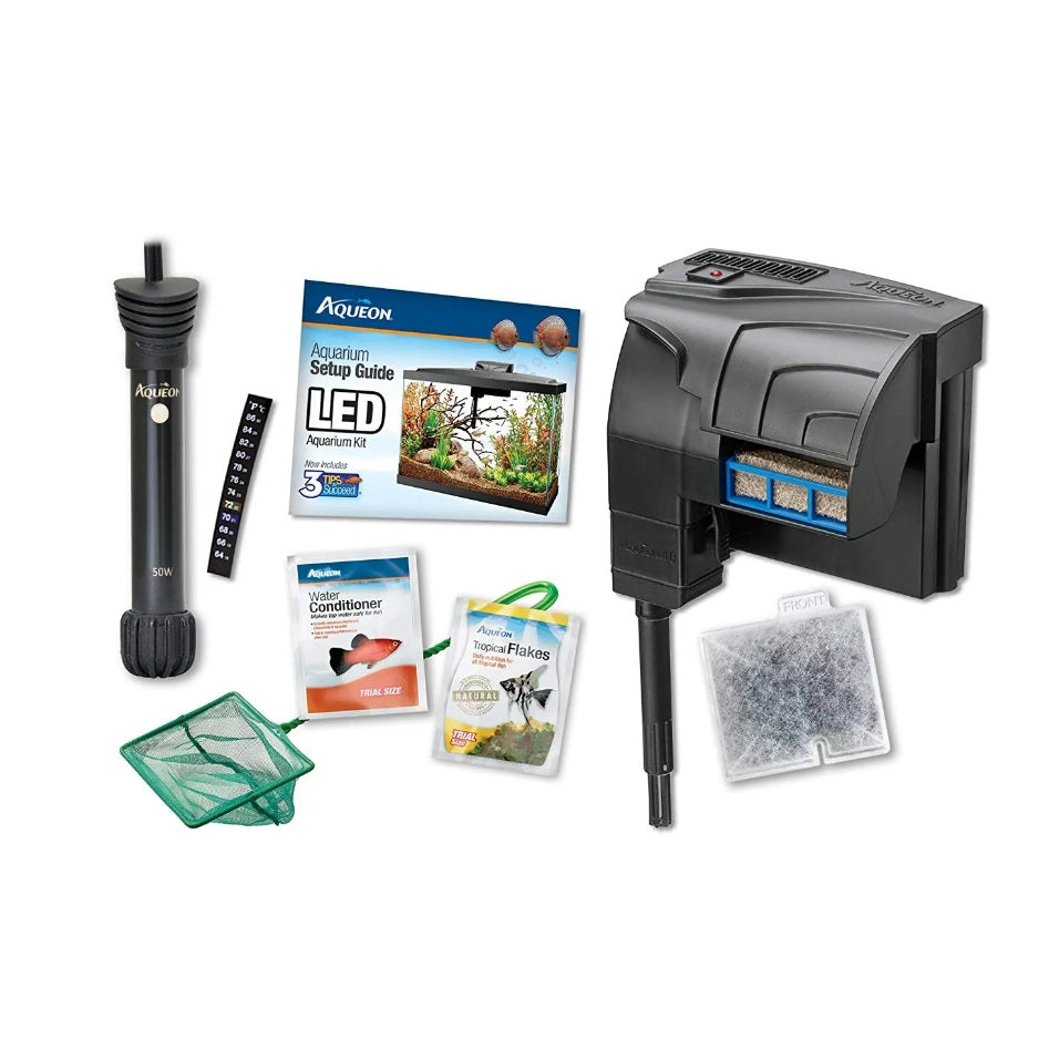 - Complete aquarium kit includes: 20 gallon glass aquarium, low profile LED full hood, QuietFlow 10 LED PRO power filter with medium cartridge, 100W preset heater, premium fish food, water conditioner, fish net, stick-on thermometer