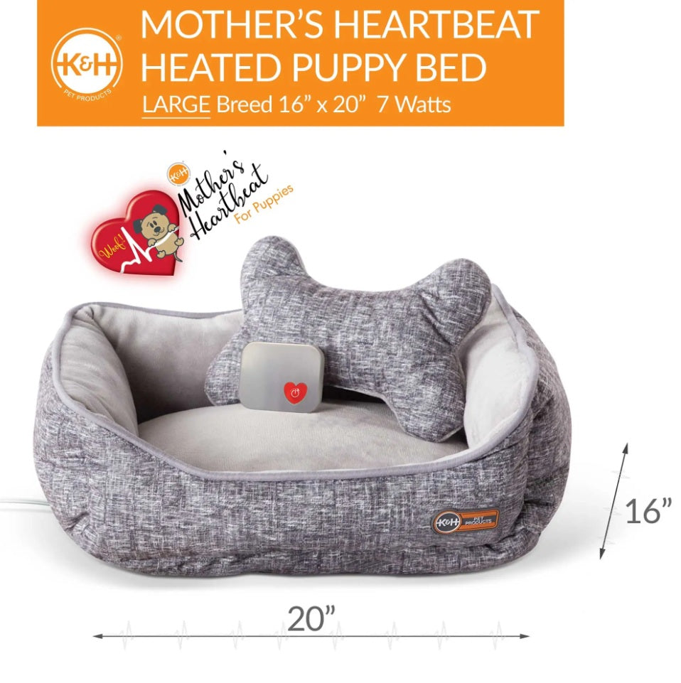 Help soothe and calm your new puppy with the melodic vibration of a mother’s heartbeat. The ingenious design of the Mother’s Heartbeat Heated Pet Bed by K&H creates the soothing feel and sound of a maternal heartbeat. Included with each cozy bed is a K&H Pet Bed Warmer, pillow, and heartbeat device.