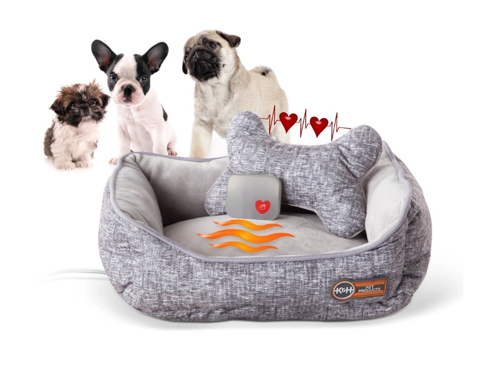Help soothe and calm your new puppy with the melodic vibration of a mother’s heartbeat. The ingenious design of the Mother’s Heartbeat Heated Pet Bed by K&H creates the soothing feel and sound of a maternal heartbeat. Included with each cozy bed is a K&H Pet Bed Warmer, pillow, and heartbeat device.