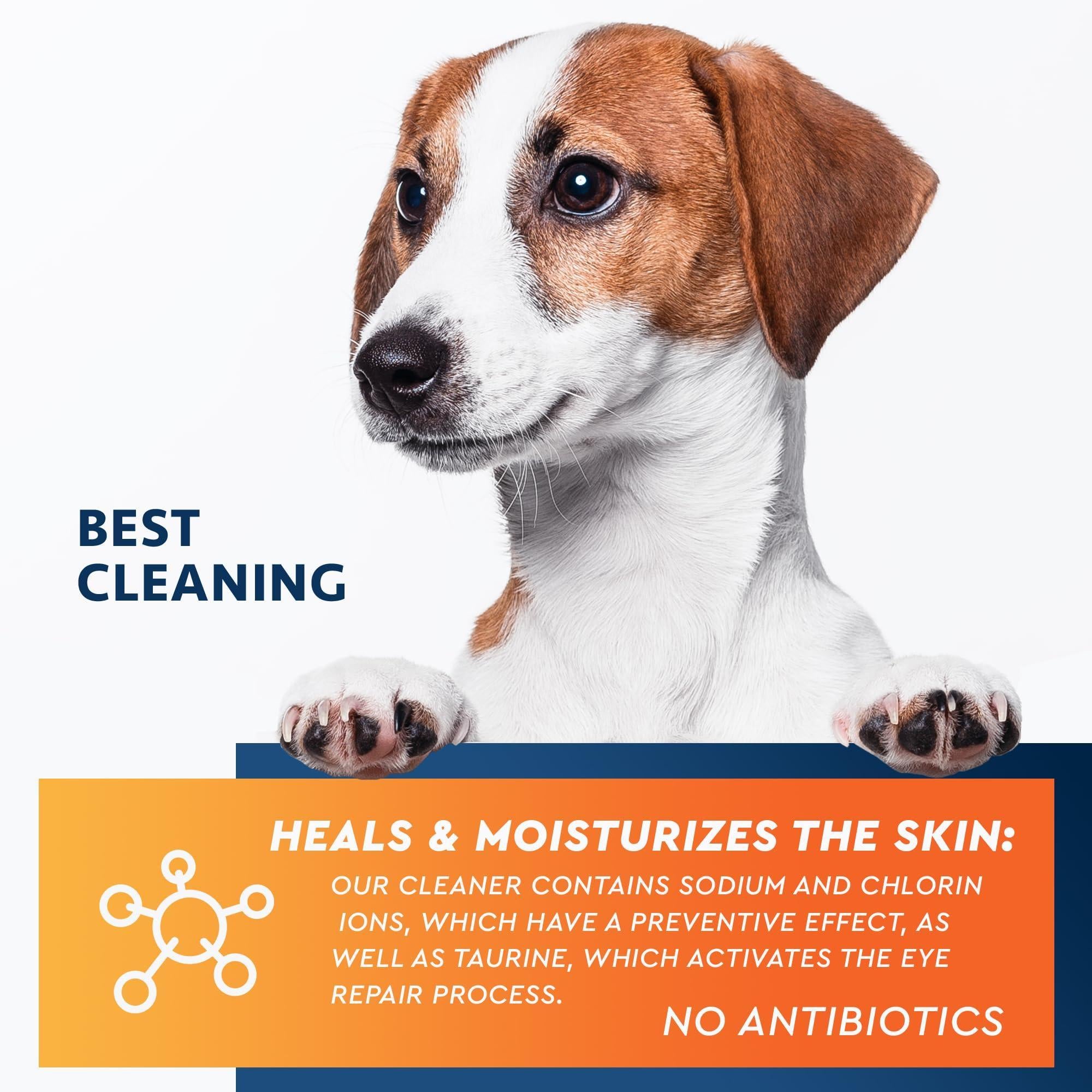 PROMOTES HEALING & SKIN SOFTENING: This cleaner is formulated with silver ions and panthenol to facilitate wound healing and skin softening, thereby ensuring vibrant and healthy skin. The presence of boric acid alleviates eyelid inflammation. It also contains taurine that stimulates pet eye restoration. It's a reliable option for preserving clear and healthy eyes, helping your dog see the world with feline-like clarity. It nourishes and promotes optimal eye health.