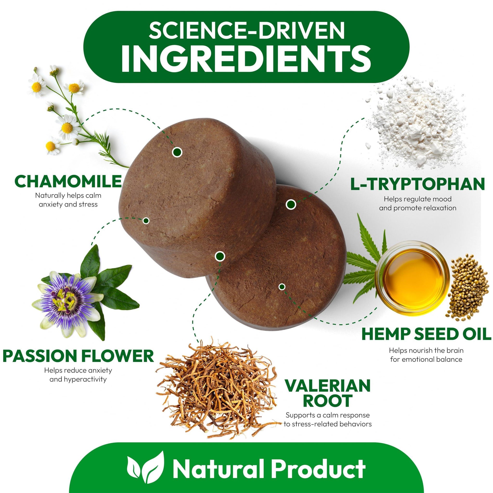 Made in the USA in an FDA-Registered Facility: Our anxiety relief dog treats are crafted under strict quality standards to ensure safety, purity, and effectiveness, giving your dog calming support.