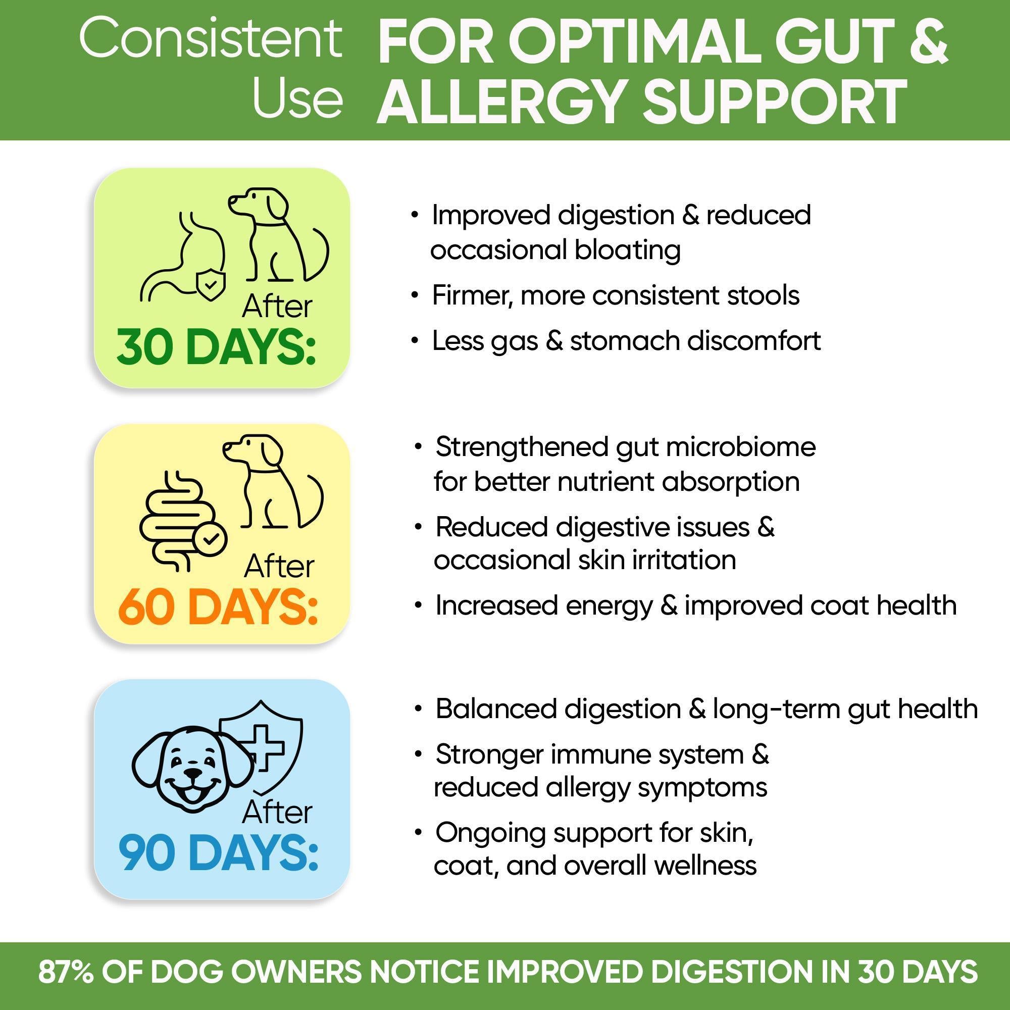 Comprehensive Digestive Support: Our Probiotic for dogs feature a blend of 6 probiotic strains, carefully selected to ensure a diverse and balanced approach to supporting your immune and gut health for dogs and address common digestive issues like diarrhea and constipation.